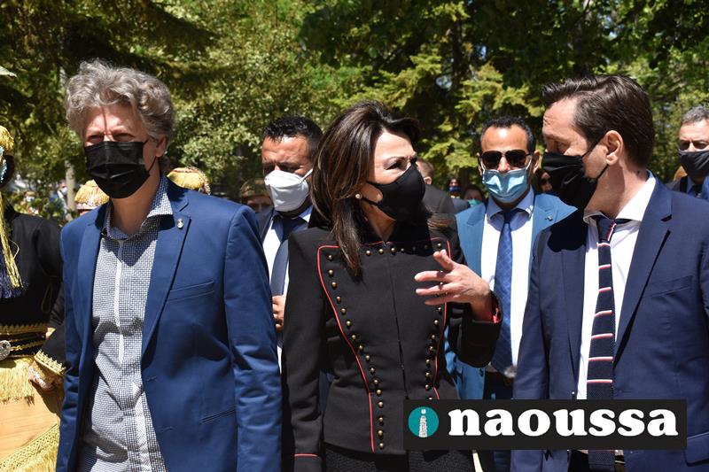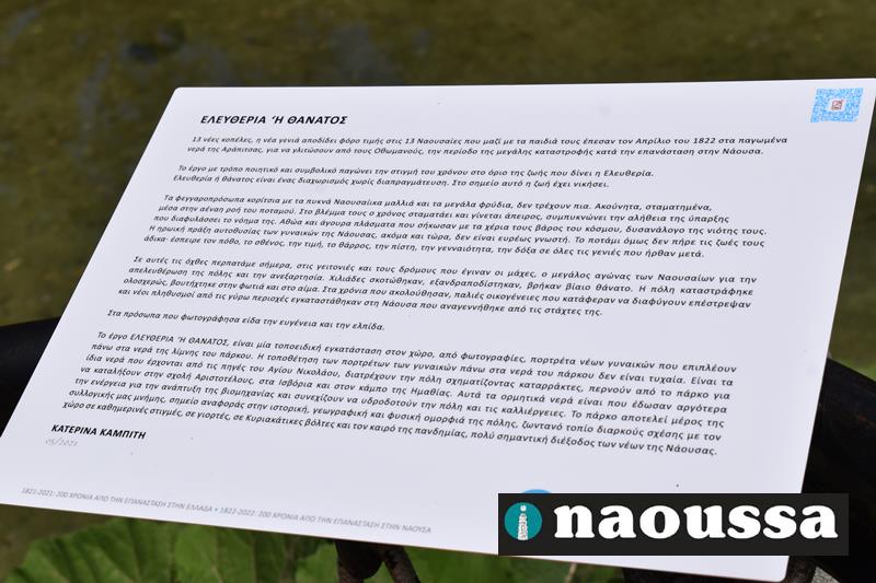 Τόσο η πρόεδρος της επιτροπής όσο και οι υπόλοιποι προσκεκλημένοι του δήμου Νάουσας περιηγήθηκαν στο πάρκο και θαύμασαν την υπαίθρια φωτογραφική εγκατάσταση «Ελευθερία ή Θάνατος».