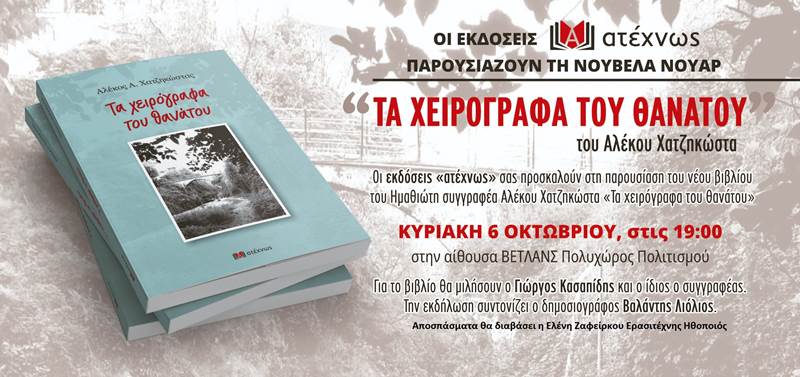 Οι εκδόσεις «ατέχνως» σας προσκαλούν στην παρουσίαση στη Νάουσα του νέου βιβλίου του Ημαθιώτη συγγραφέα Αλέκου Χατζηκώστα «Τα χειρόγραφα του θανάτου»